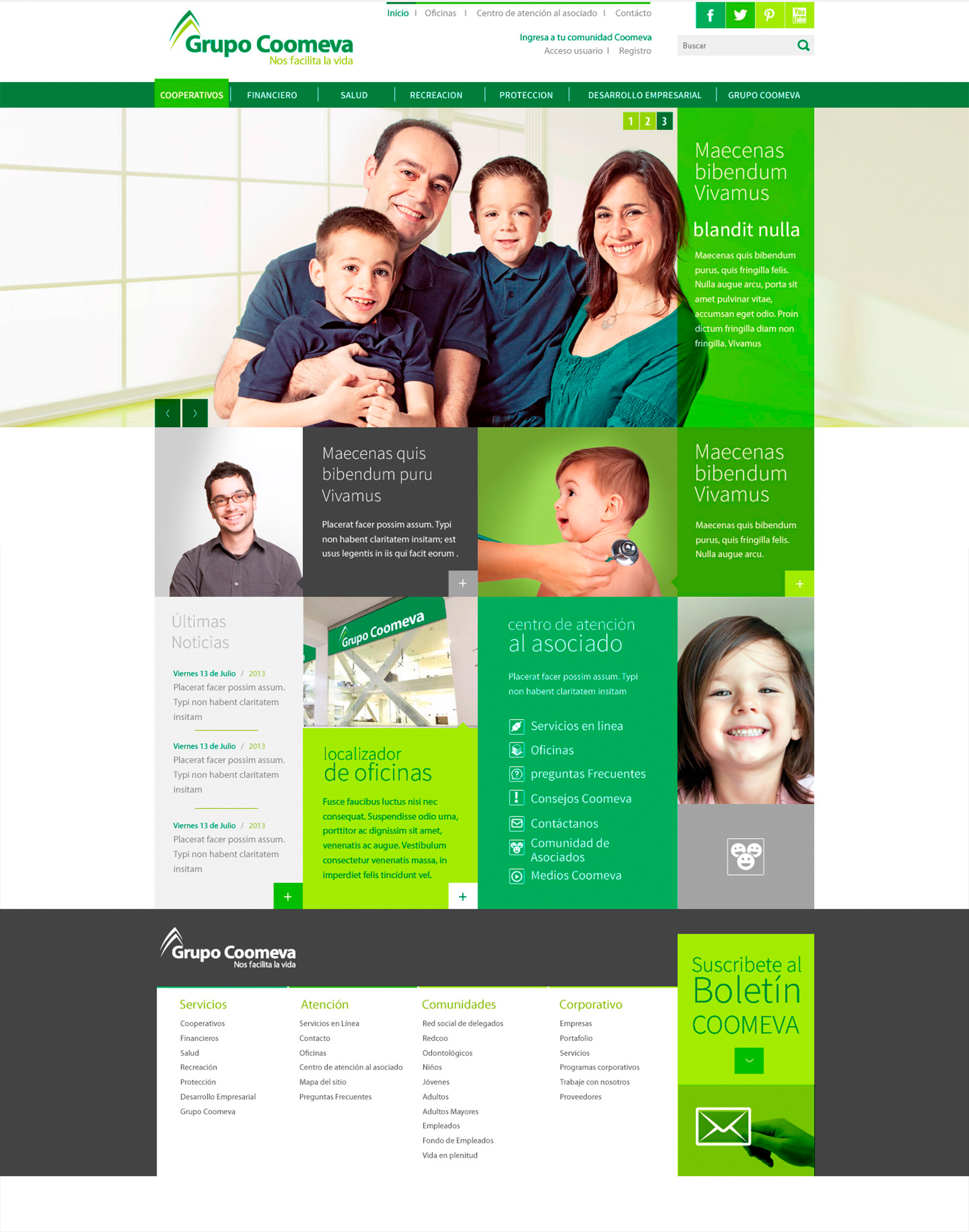 When I came to this project their site has a 90 ‘s look with a lot of bevels and shadows, the main idea here was to change that look and feel, and give it a more actual design, I chose to work with a flat design involving a rich green pallet. The content directly involve with services and options of the site will use green and the news and other kind of content will use gray colors. I chose pictures of lifestyle and family where faces were the main focus that gives the site a more human look and feel.